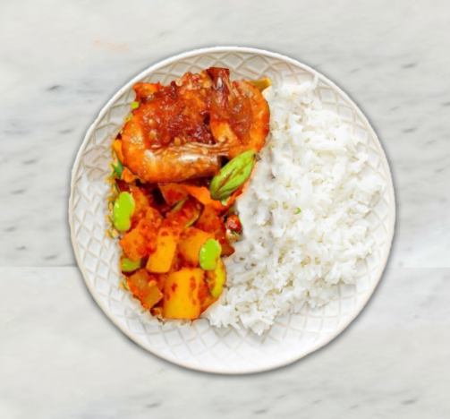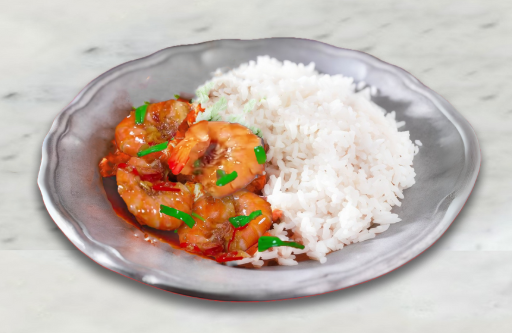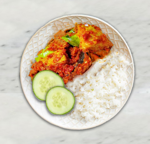 Gambar ini dibuat dengan menggabungkan elemen-elemen terpisah hasil pencarian di Google, seperti udang, nasi, pete, dan piring. Setiap elemen melalui proses cut-out, penyesuaian warna, serta penyusunan ulang hingga menjadi ilustrasi makanan yang tampak utuh dan realistis.